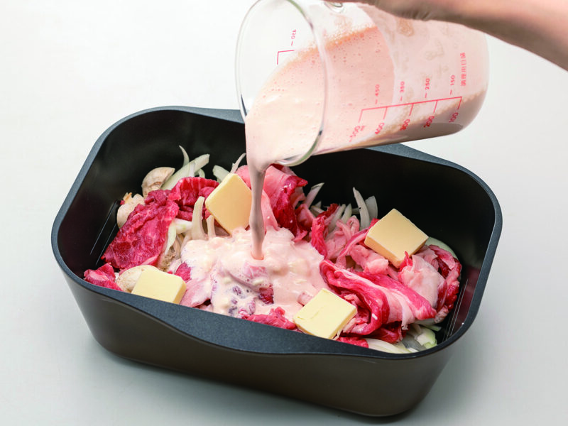 ラ・クックグランポットに玉ねぎ、マッシュルーム、1の順に入れ、合わせたAを加えて、ふたをしてグリルで約15分加熱します。(点火操作から15秒以内にタイマーを設定してください)