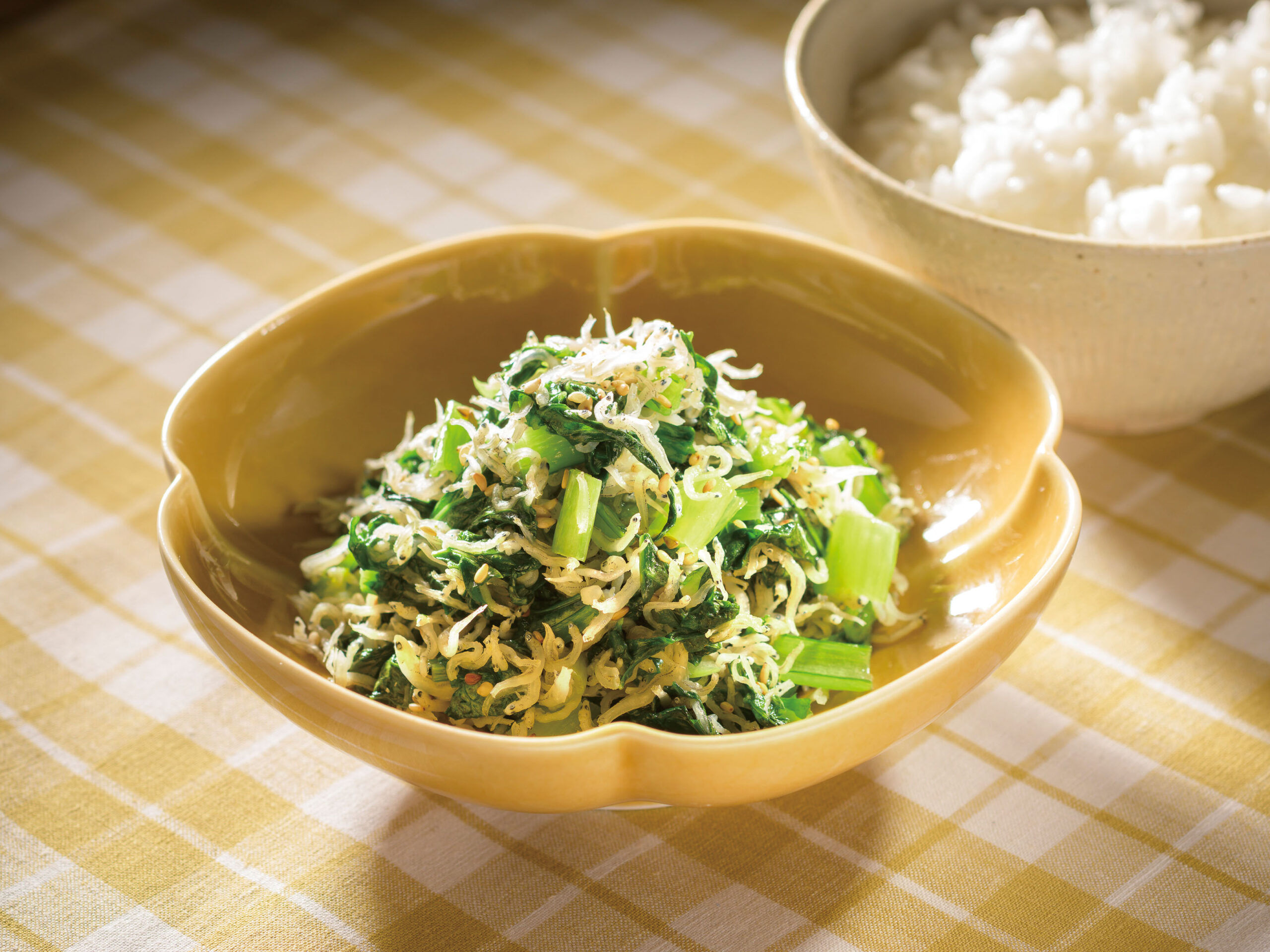 温度キープ機能を160℃に設定し、フライパンにごま油を熱し、じゃこ、小松菜を炒めます。