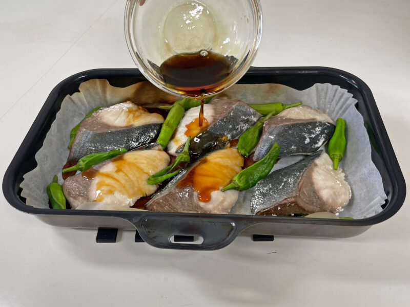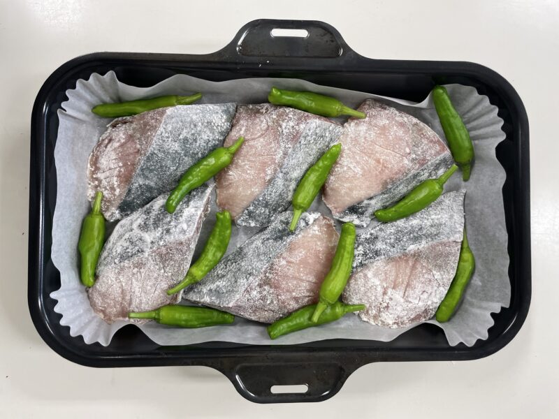 ①に小麦粉を軽くまぶし、ラ・クックグランに並べて、ふたをしてグリルで約8分加熱します。