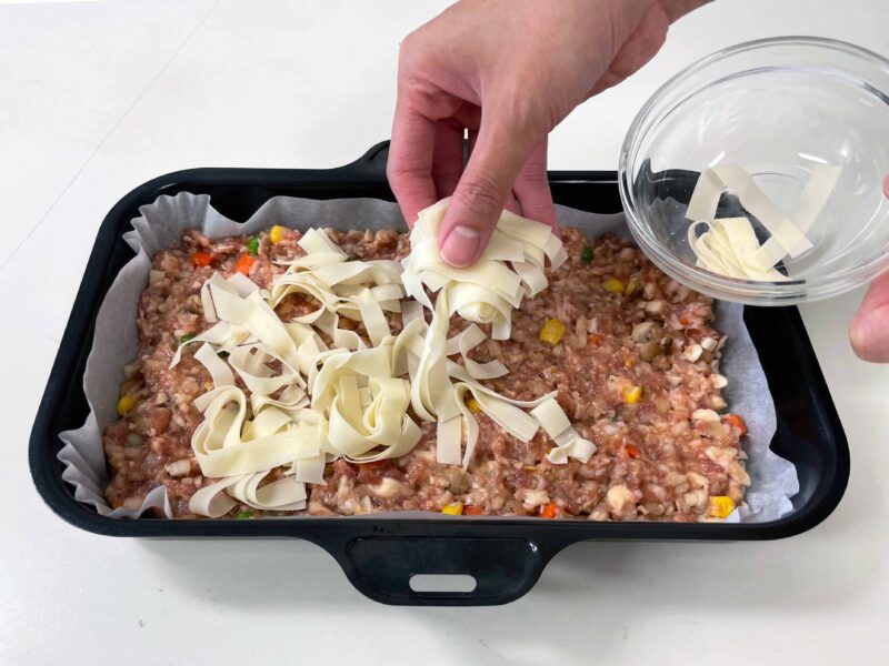 ラ・クックグランにクッキングシートを敷き、③を広げながらのせて、上に①を散らし、ふたをしてグリルで約8分焼きます。