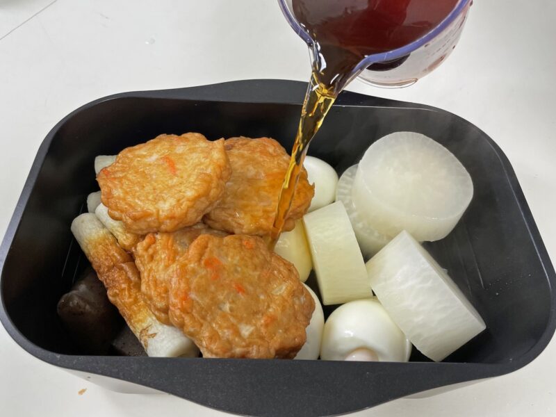 ラ・クックグランポッドに①とちくわ、ゆで卵、はんぺんを入れ、合わせた Aを入れてふたをしてグリルの強火で約15分加熱します。