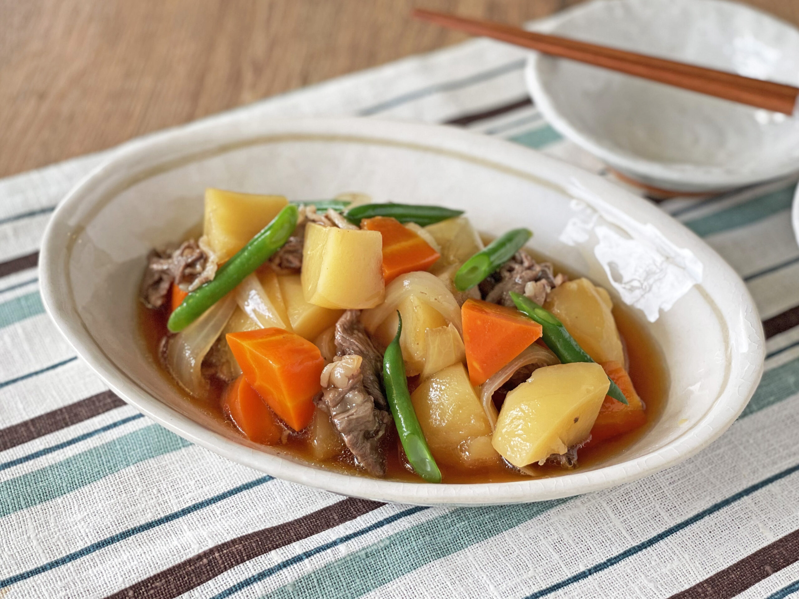 牛肉は一口大に切り、じゃがいもとにんじんは一口大の乱切りに、玉ねぎはくし切りに切ります。