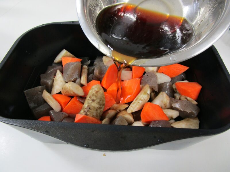ごぼうとにんじんは一口大の乱切りに切り、こんにゃくはスプーンでちぎります。
