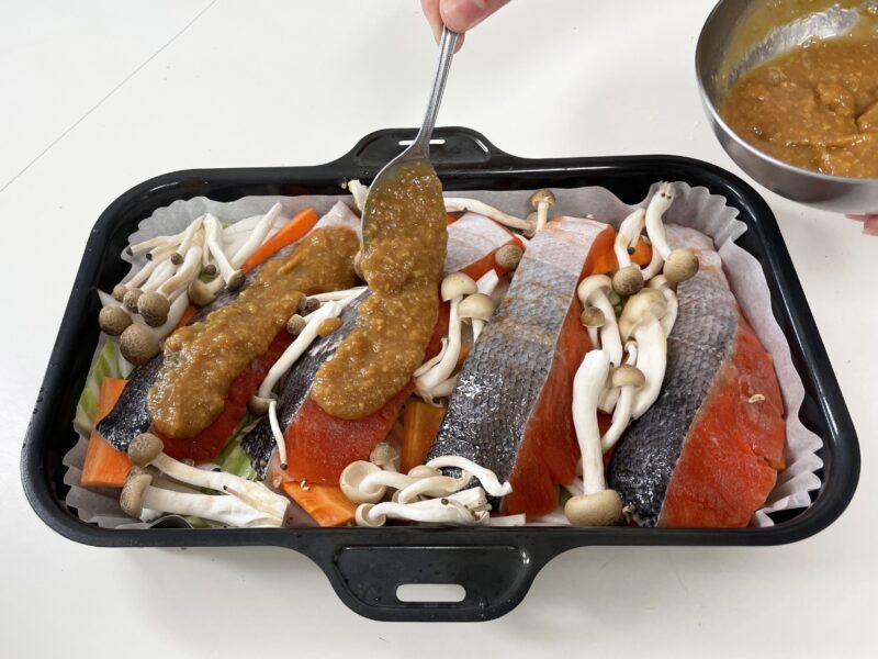 ラ・クックグランにクッキングシートを敷き、②をのせ、その上に①をのせて、合わせたBをかけます。