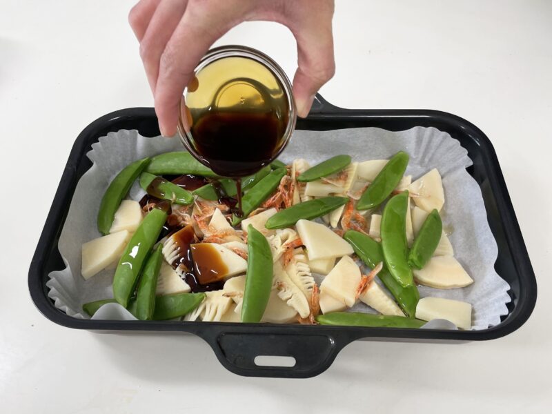 クッキングシートを敷いたラ・クックグランに①と桜えびを入れ、ごま油とオイスターソースをかけて、ふたをしてグリルの強火で約7分加熱します。