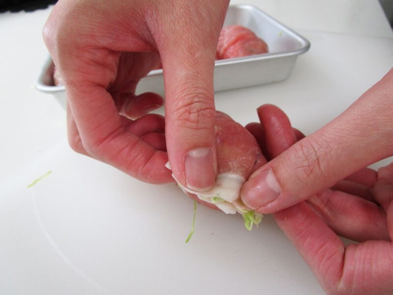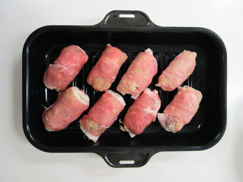 キャベツがしんなりしたら8等分に分け、それぞれ豚肉で巻きます。