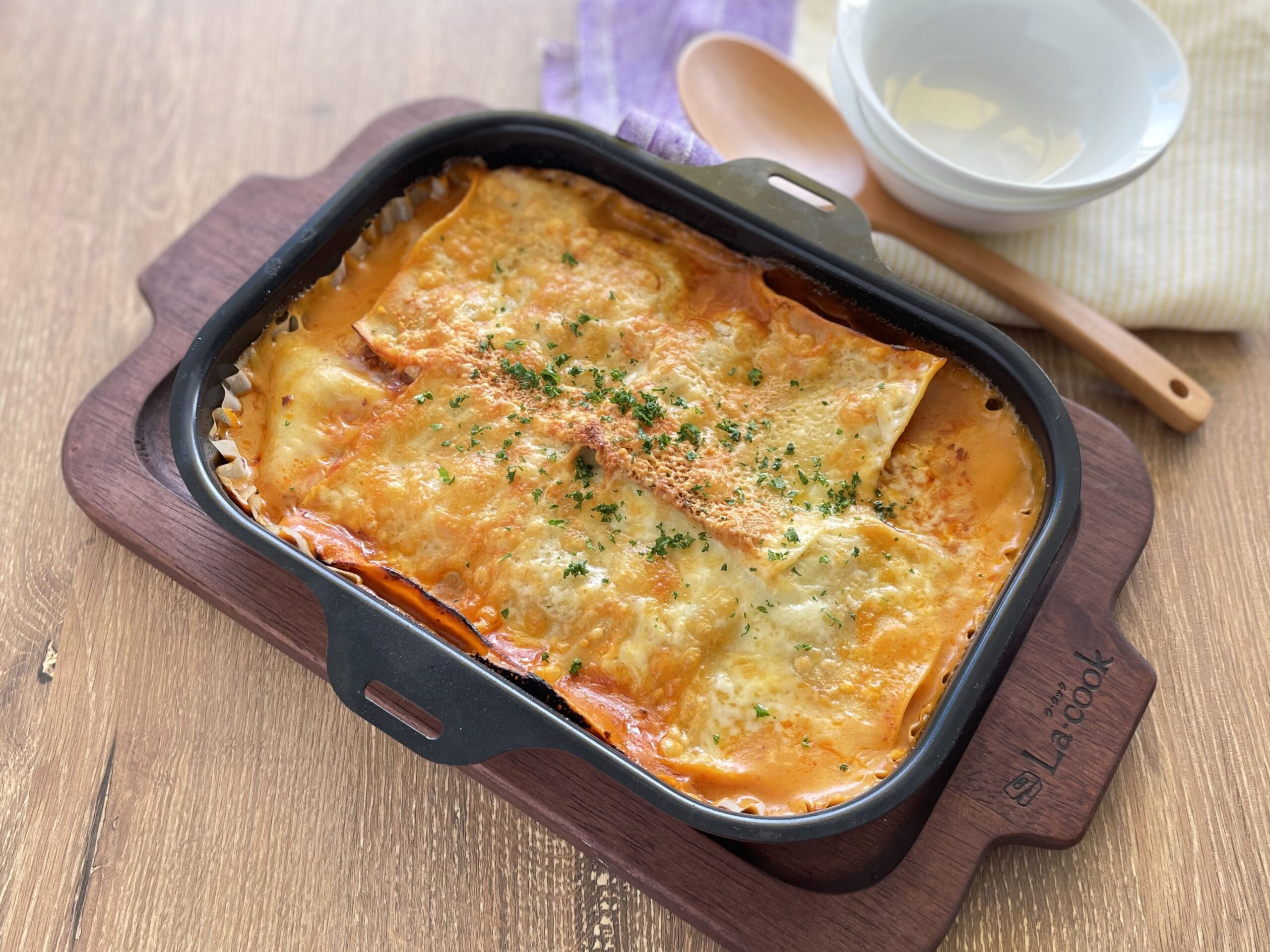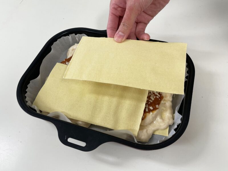 クッキングシートを敷いたラ・クックにホワイトソースを敷き、その上にミートソースを広げ、ピザ用チーズをかけて、①のラザニアを2枚載せます。