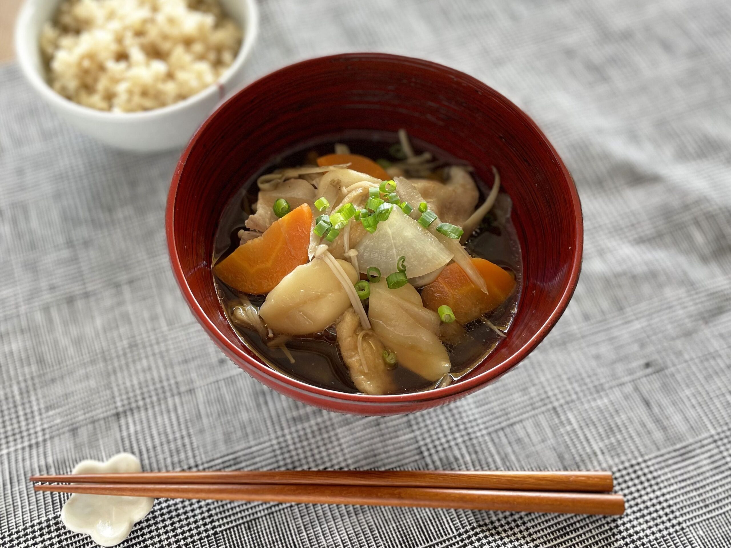 豚肉は一口大に切り、にんじんは半月切り、大根はいちょう切りに、ごぼうはささがきにします。