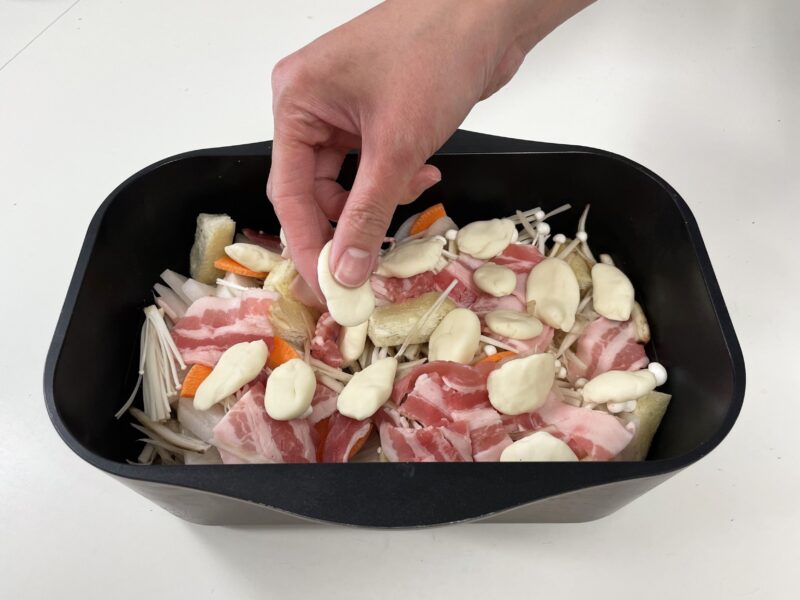 ラ・クックグランポットに①と②を入れ、③を一口大にちぎって手で平たく伸ばして加え、合わせたBを注ぎ、ふたをしてグリルの強火で約15分加熱します。