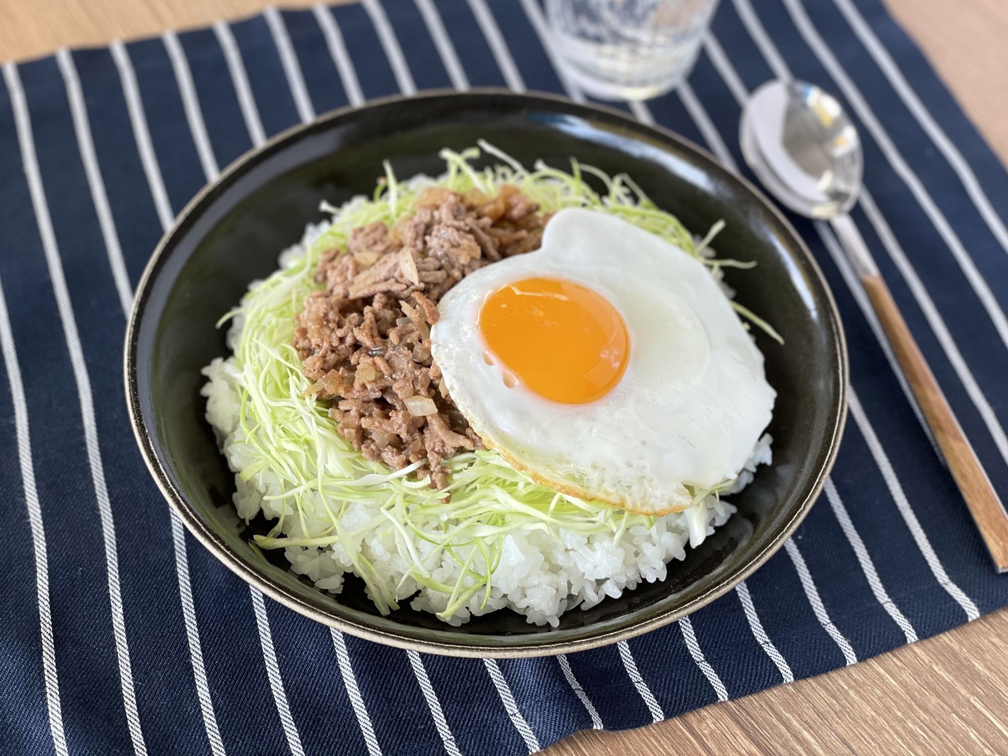 ご飯の上に千切りキャベツをのせてステップ3をのせ、お好みで目玉焼きをのせます。