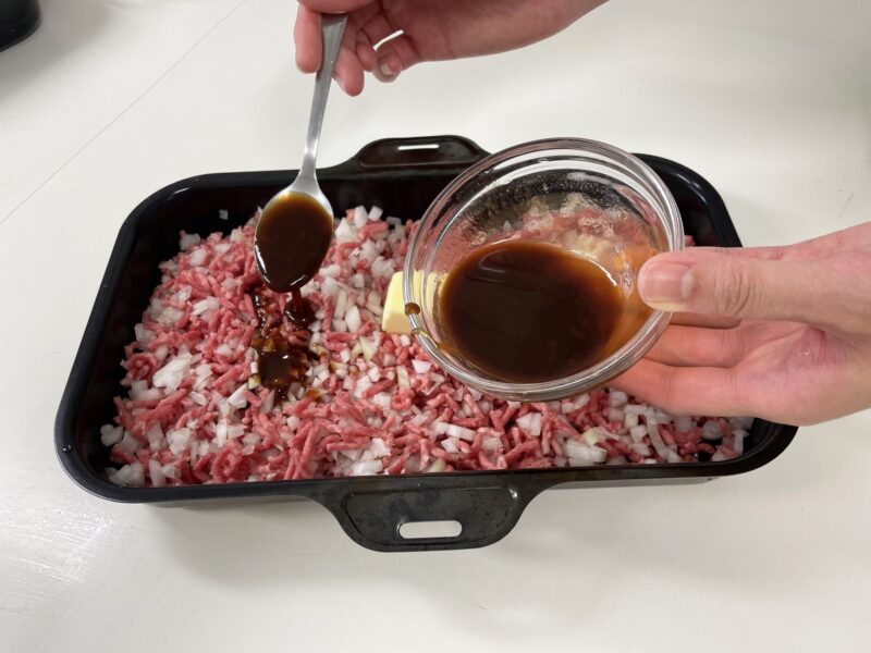 ラ・クックグランに合挽き肉と玉ねぎ、塩・こしょうを入れて軽く混ぜます。