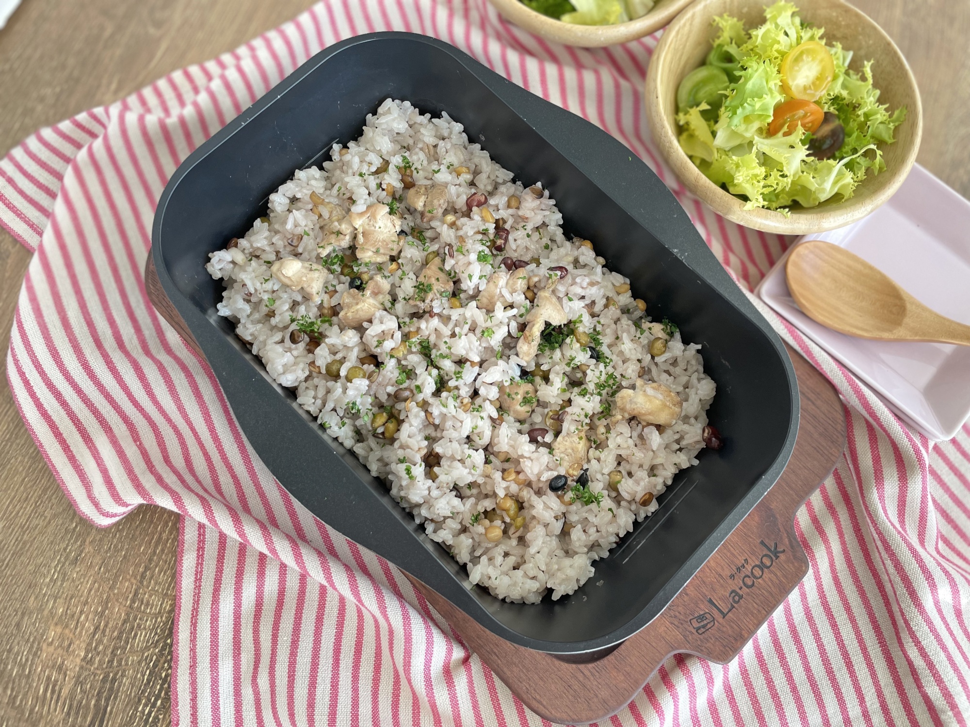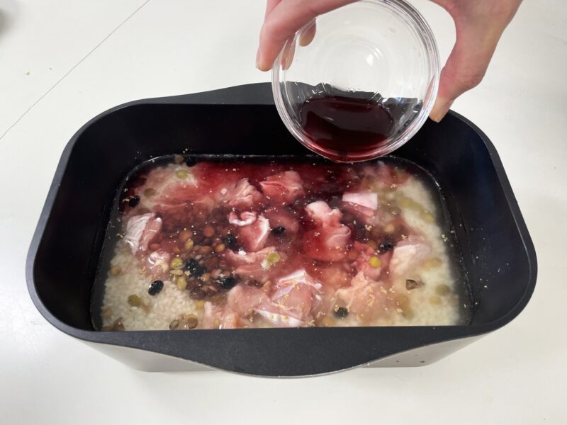 ラ・クックグランポットに①とAを入れて軽く混ぜ、ミックスビーズと②をのせ、赤ワインを加えてふたをしてグリルの強火で約15分加熱します。
